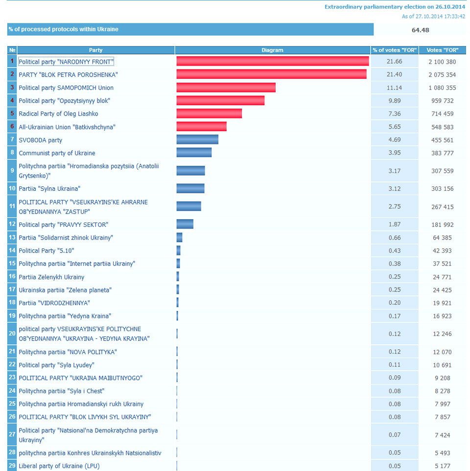 According to the Central Elections Commission’s which processed 64% of protocols (voting reports), 6 parties enter Ukrainian Parliament: