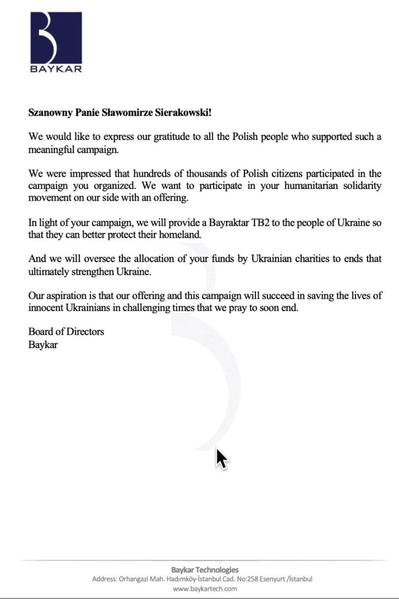 “We would like to express our gratitude to all the Polish people who supported such a meaningful campaign. We were impressed that hundreds of thousands of Polish citizens participated in the campaign you organized. We want to participate in your humanitarian solidarity movement on our side with an offering. In light of your campaign, we will provide a Bayraktar TB2 to the people of Ukraine so that they can better protect their homeland,” the company said.