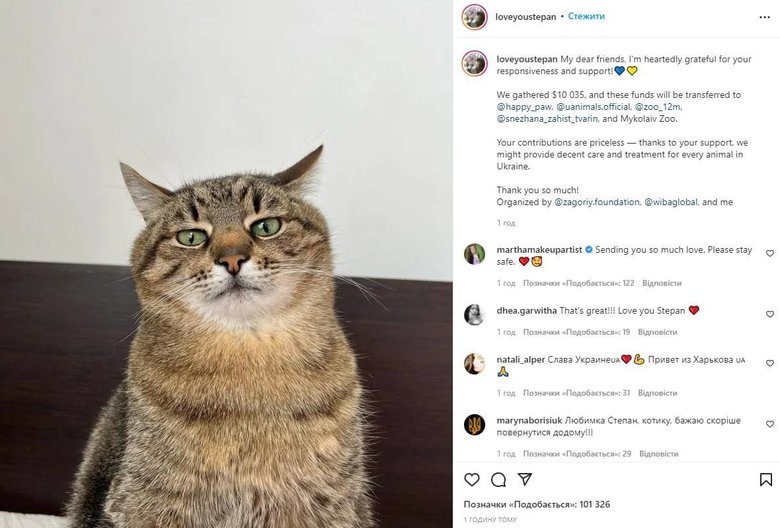 Instagram star cat Stepan raised $ 10,000 to help animals in Ukraine