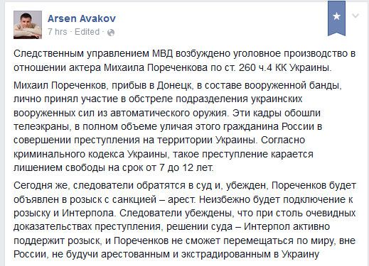 “Investigation Department of the Interior Ministry initiated criminal proceedings against actor Mikhail Porechenkov under Art. 260, Part 4 of the Criminal Code of Ukraine.” – says the Minister of Interior Affairs Arsen Avakov