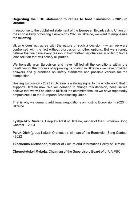 “In response to the published statement of the European Broadcasting Union on the impossibility of holding Eurovision – 2023 in Ukraine, we want to emphasize the following. Ukraine does not agree with the nature of such a decision – when we were confronted with the fact without discussing the possibility of other options. We believe that we have every reason to hold further negotiations and find a joint solution that will satisfy all parties. We honestly won Eurovision – 2022 and have now fulfilled all the conditions in the specified time for the process of approval of its holding in Ukraine – provided answers and guarantees on safety standards and possible venues for the competition.”