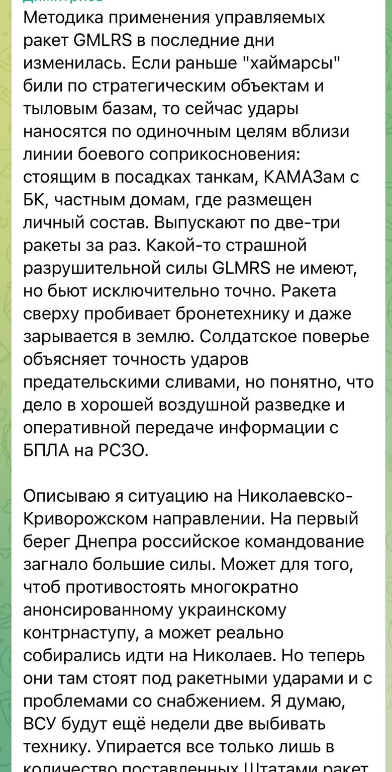 Important news has appeared on the Russian Telegram channel. It states that the Armed Forces of Ukraine launched a targeted attack against Russian manpower and equipment after disabling large ammunition depots, the bridges across Dnieper River at Kakhovskyy bridgehead and destroying a significant part of Russian air defense.
