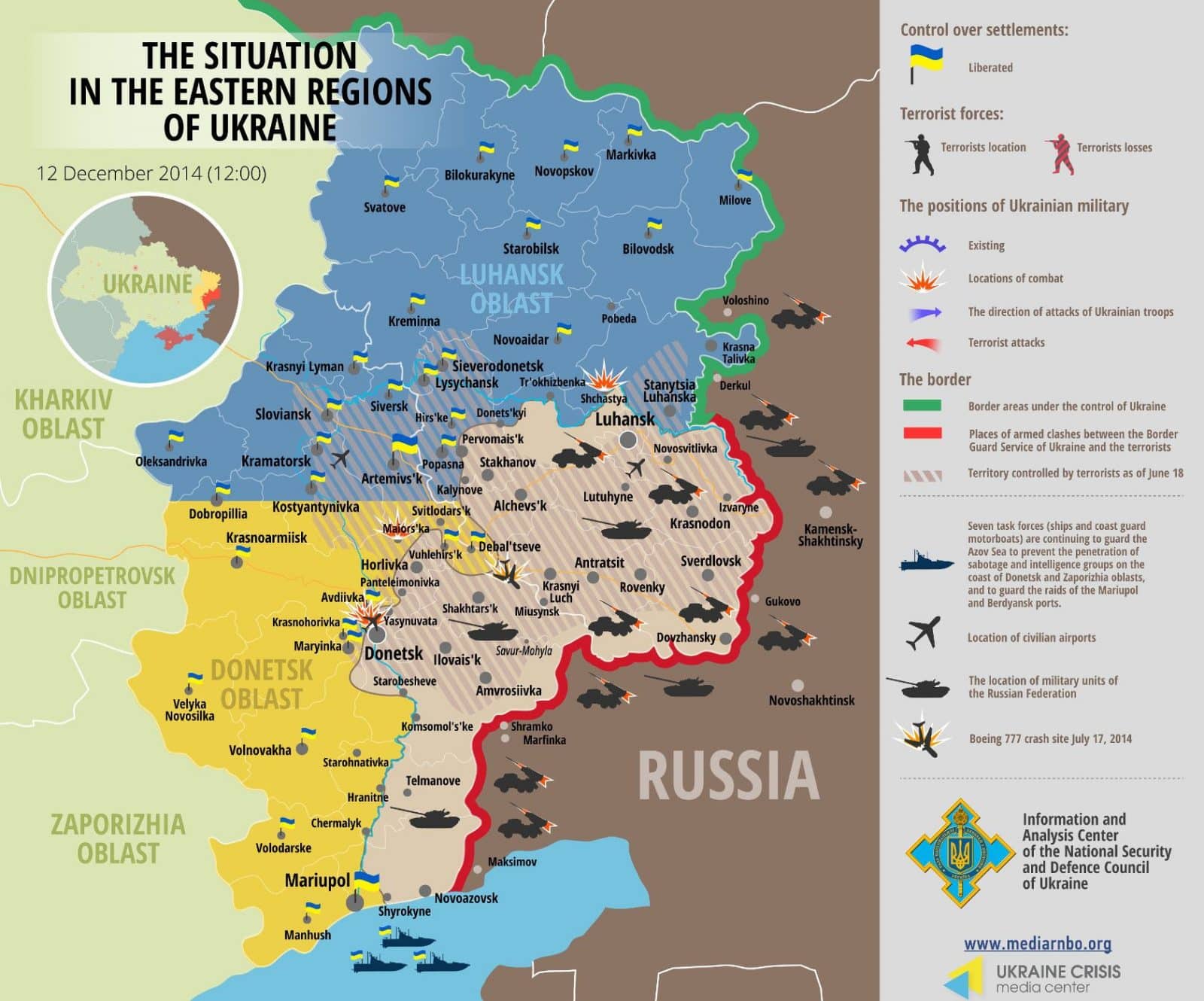 Kyiv, 12 December 2014 – Yesterday no cases of heavy military equipment, artillery or Grad multiple rocket launcher systems in use were observed in Eastern Ukraine. One Ukrainian serviceman was injured having triggered a trip wire in the area of Pisky town. Illegal armed groups are holding organizational and mobilization measures to create the unified command in control of the defined gangs and to form the brigades according to the Russian standards. The brigades are being mainly staffed with the so-called “volunteers” from the Russian Federation.